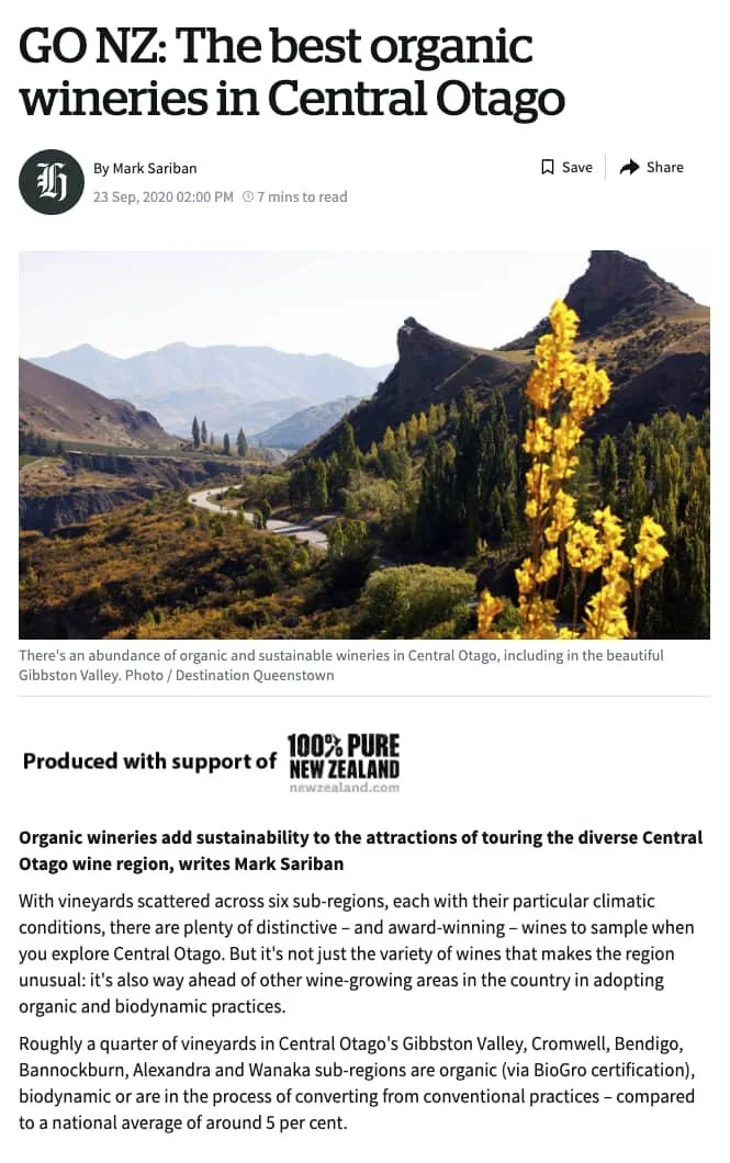 While working with Tourism New Zealand to highlight the country’s sustainable travel initiatives, I pitched this story about touring organic wineries in Central Otago to the NZ Herald newspaper – many Kiwis weren't aware that around a quarter of all the vineyards in this South Island wine region are organic or biodynamic, compared to a national average of 5 per cent.
